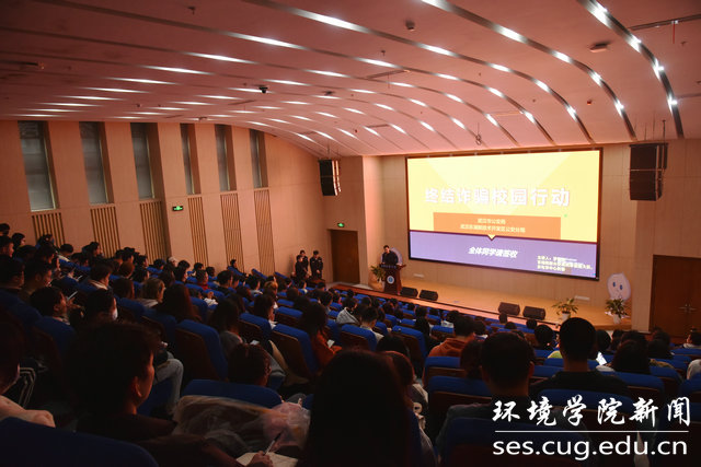 (通讯员徐皓杰 摄影/编辑耿婧)3月16日下午,环境学院在科教楼四108报告厅举办安全文明知识宣讲活动。东湖高新公安局刑事侦查大队、反电诈中心民警罗镕浩来院做专题讲座,环境学院党委副书记王海锋,学工组专、兼职辅导员,学院研究生和本科生代表参加讲座。辅导员孟庆达主持讲座。