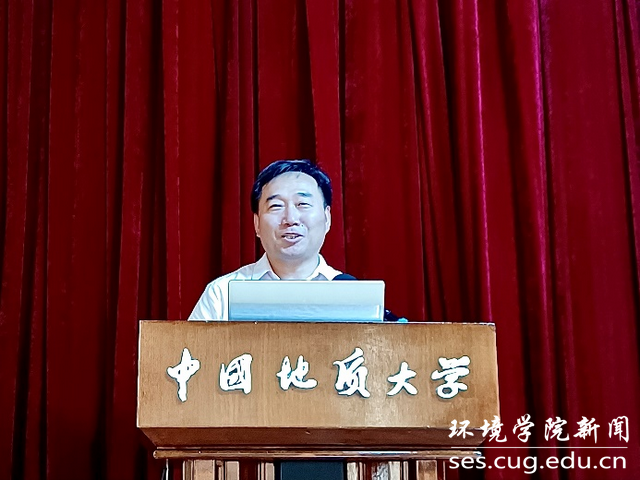 班主任代表刘邓教授发言。他向全体新生来到地大环境学院求学表示欢迎。他结合自身大学求学经历,寄语新生要建设强大的内心,提高自我驱动力,善于发掘自身的闪光点,珍惜大学期间的友情、师生情,传承地大环境人的“英雄气”。他代表全体新生班主任表示将守好班主任的职责,为同学们的大学生活保驾护航。