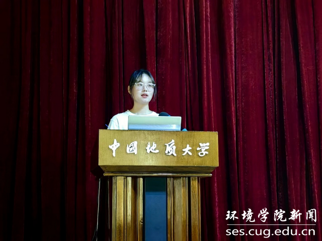 高年级学生代表王倩发言。她代表学院高年级学生向新生表示热烈的欢迎和问候。她列举地大楷模的光辉事迹,讲述青年大学生在新时代的担当与作为,希望同学们能够向优秀的学长学姐学习,做到有理想、有斗志、有赤诚,在环境学院去遇见最好的自己,共同去创造最美的时代。