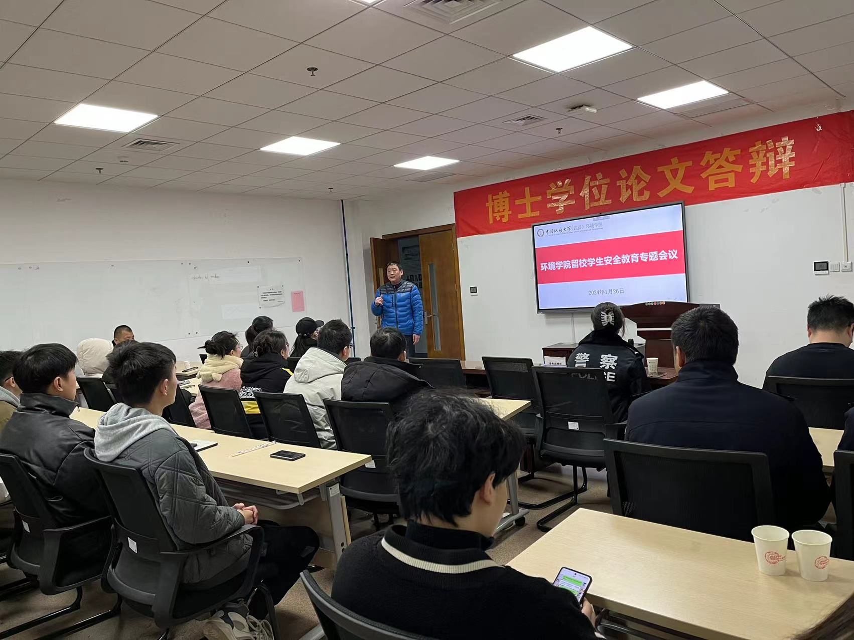 (通讯员陈俊男 摄影徐皓杰、周余 编辑耿婧)根据学校工作部署和学院工作具体安排,为进一步加强学院寒假留校学生安全教育管理工作,增强留校学生安全防范意识和能力,切实保障大家生命财产安全。1月26日上午,学院留校学生安全教育专题会议在环境楼322召开。未来城校区保卫综合办公室主任张献文,东湖高新分局左岭派出所韩红卫警官、董佩珏警官,学院辅导员耿婧,本研课题组、宿舍以及实验室学生代表参会。耿婧主持会议。