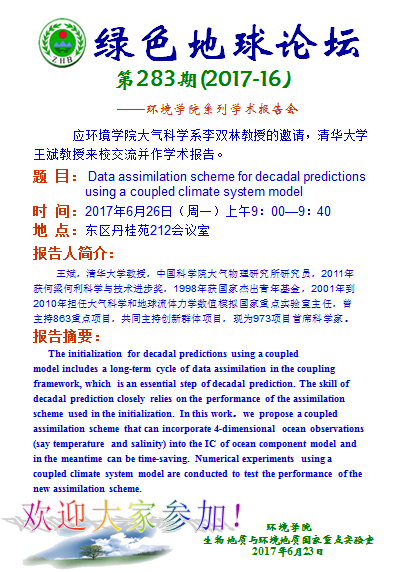 绿色地球论坛第283期(2017-16) ——环境学院系列学术报告会 题目: Data assimilation scheme for decadal predictions using a coupled climate system model 时间:2017年6月26日(周一)上午9:00—9:40 地点:东区丹桂苑212会议室