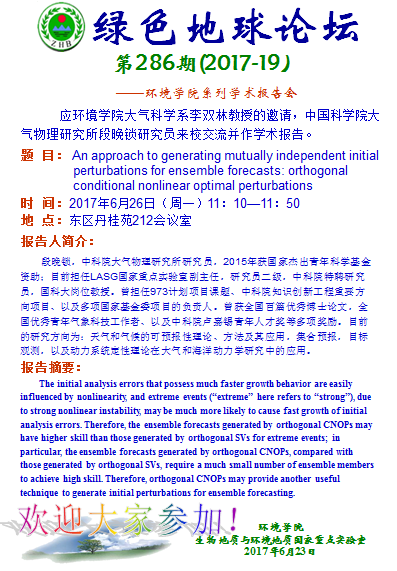 绿色地球论坛第286期(2017-19) ——环境学院系列学术报告会 题目:An approach to generating mutually independent initial perturbations for ensemble forecasts: orthogonal conditional nonlinear optimal perturbations 时间:2017年6月26日(周一)上午11:10—11:50 地点:东区丹桂苑212会议室