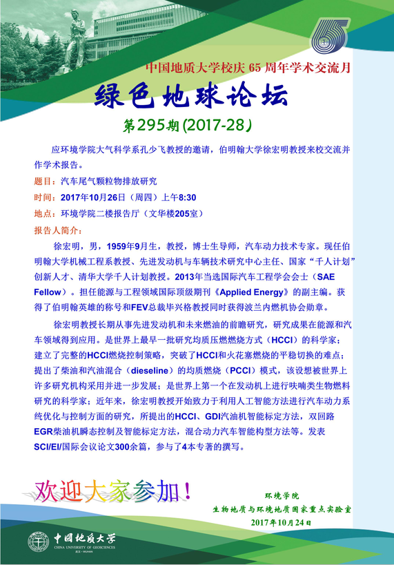 绿色地球论坛第295期(2017-28) ——环境学院系列学术报告会 题目:汽车尾气颗粒物排放研究 时间:2017年10月26日(周四)上午8:30 地点:环境学院二楼报告厅(文华楼205室)