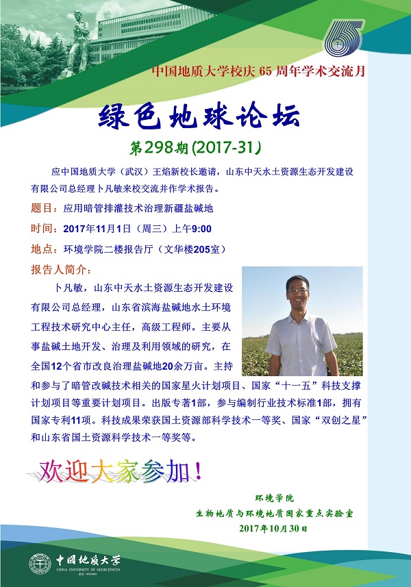 绿色地球论坛第298期(2017-31) ——环境学院系列学术报告会 题目:应用暗管排灌技术治理新疆盐碱地 时间:2017年11月1日(周三)上午9:00 地点:环境学院二楼报告厅(文华楼205室)