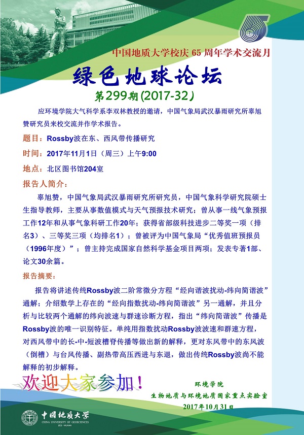 绿色地球论坛第299期(2017-32) ——环境学院系列学术报告会 题目:Rossby波在东、西风带传播研究 时间:2017年11月1日(周三)上午9:00 地点:北区图书馆204室