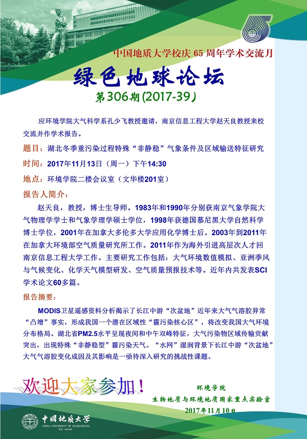 绿色地球论坛第306期(2017-39) ——嗨皮漫画 系列学术报告会 题目:湖北冬季重污染过程特殊“非静稳”气象条件及区域输送特征研究 时间:2017年11月13日(周一)下午14:30 地点:嗨皮漫画 二楼会议室(文华楼201室)