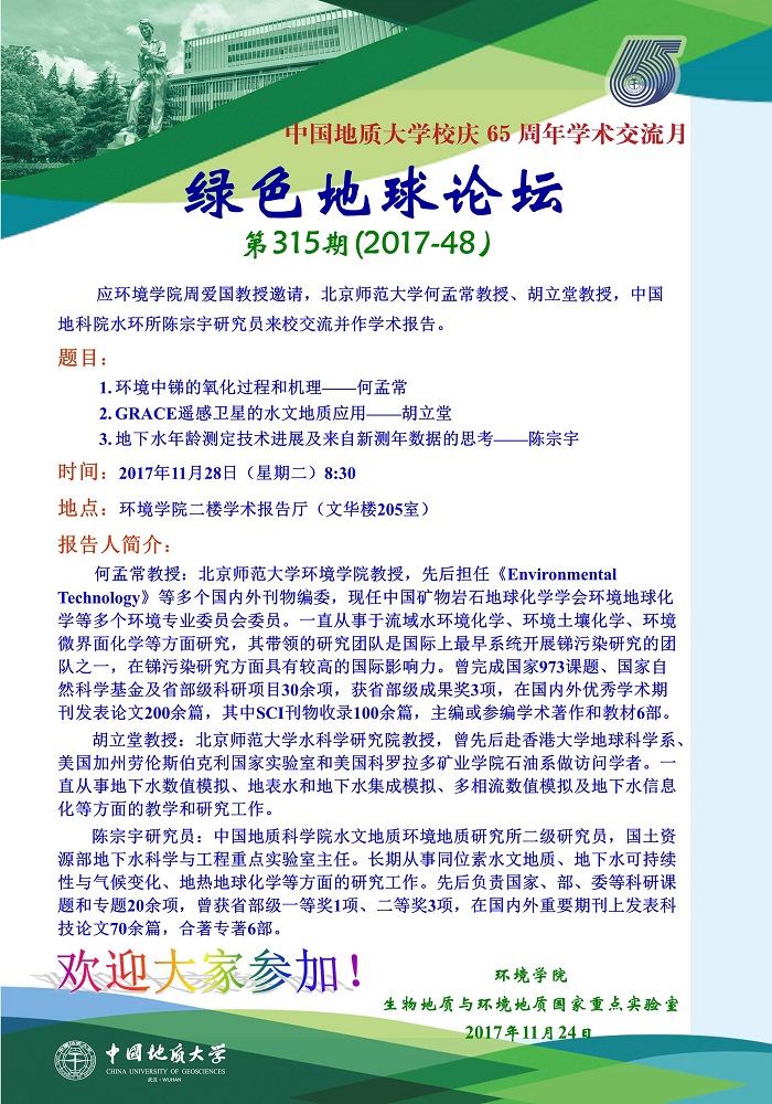 绿色地球论坛第315期(2017-48) 环境学院“校庆65周年学术交流月”——高知论坛 题目: 1. 环境中锑的氧化过程和机理——何孟常 2. GRACE遥感卫星的水文地质应用——胡立堂 3. 地下水年龄测定技术进展及来自新测年数据的思考——陈宗宇 时间:2017年11月28日(周二)上午8:30 地点:环境学院二楼学术报告厅(文华楼205室)