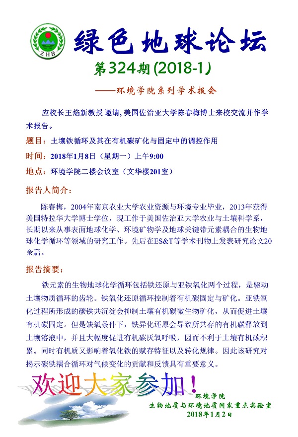 绿色地球论坛第324期(2018-1)——环境学院系列学术报告会 题目:土壤铁循环及其在有机碳矿化与固定中的调控作用 时间:2018年1月8日(星期一)上午9:00 地点:环境学院二楼会议室(文华楼201室)
