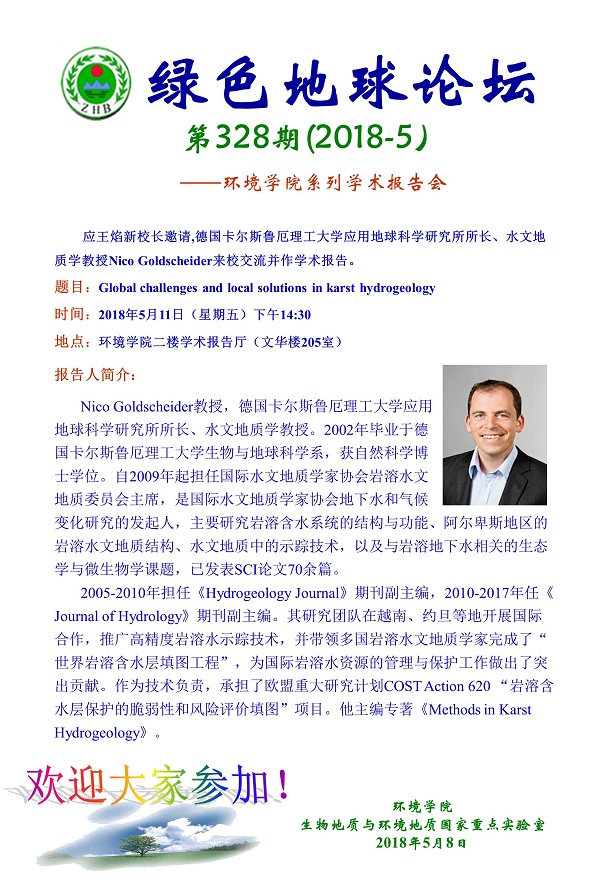 绿色地球论坛第328期(2018-5) ——环境学院系列学术报告会 题目:Global challenges and local solutions in karst hydrogeology 时间:2018年5月11日(周五)下午14:30 地点:环境学院二楼学术报告厅(文华楼205室)