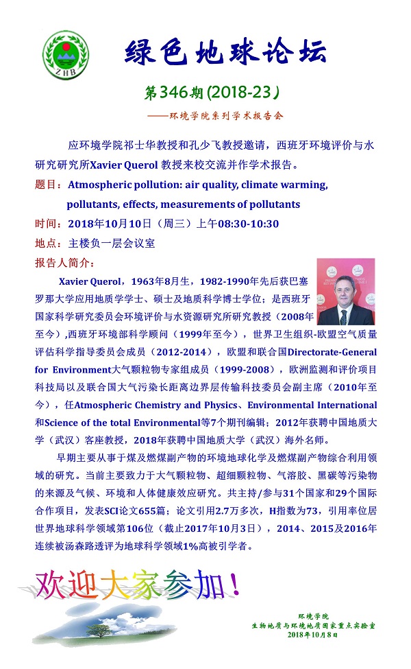 绿色地球论坛第346期(2018-23) ——环境学院系列学术报告会 题目:Atmospheric pollution: air quality, climate warming, pollutants, effects, measurements of pollutants 时间:2018年10月10日(周三)上午08:30-10:30 地点:主楼负一层会议室