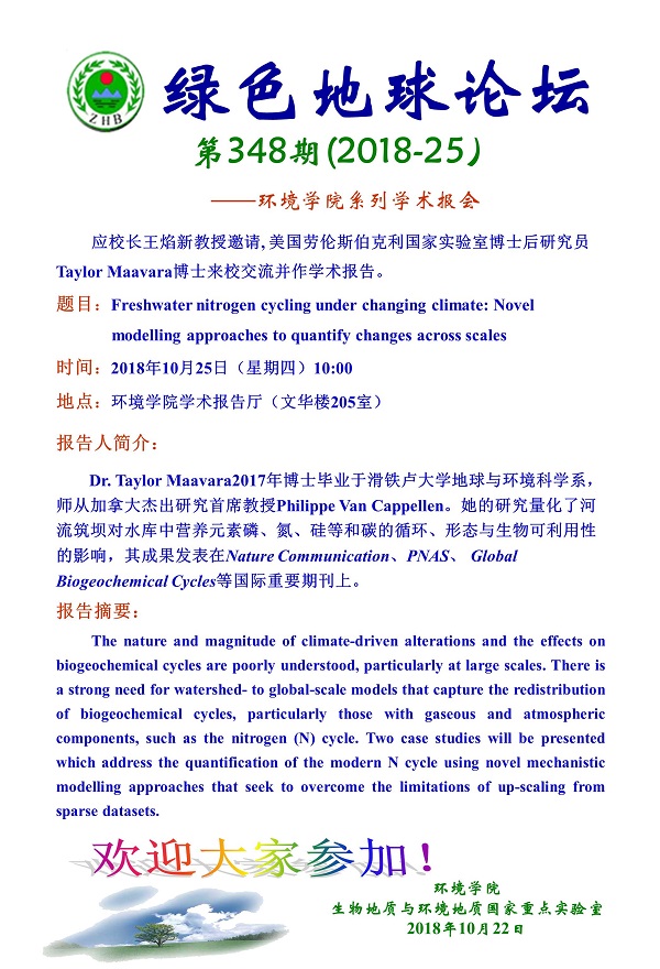 绿色地球论坛第348期(2018-25) ——嗨皮漫画 系列学术报告会 题目:Freshwater nitrogen cycling under changing climate: Novel modelling approaches to quantify changes across scales 时间:2018年10月25日(周四)上午10:00 地点:嗨皮漫画 学术报告厅(文华楼205室)