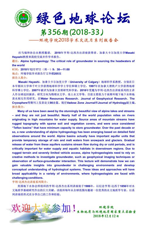 绿色地球论坛第356期(2018-33) ——环境学院2018学术交流月系列报告会 题目:Alpine hydrogeology: The critical role of groundwater in sourcing the headwaters of the world 时间:2018年12月17日(周一)9:30—11:00 地点:环境学院学术报告厅(文华楼205室)