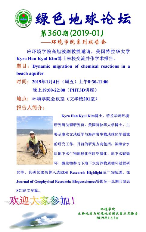绿色地球论坛第360期(2019-01) ——环境学院系列学术报告会 题目:Dynamic migration of chemical reactions in a beach aquifer 时间:2019年1月4日(周五)8:30—11:00 19:00-22:00(PHT3D讲座) 地点:环境学院会议室(文华楼201室)