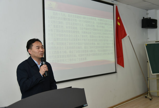 他强调,党的十九大,是在全面建成小康社会决胜阶段、中国特色社会主义进入新时代的关键时期召开的一次十分重要的大会。这是新时代、新要求、新目标、新作为的指导思想、行动指南和行动纲领。学习好宣传好落实好习近平总书记报告和十九大精神是当前和今后一个时期的一项重要政治任务。每一名党员和每一个师生都必须坚持和遵循。深刻领会党的十九大的主题,深刻领会习近平新时代中国特色社会主义思想的历史地位和丰富内涵,深刻领会党的十八大以来党和国家事业发生的历史性变革,深刻领会中国特色社会主义进入了新时代,深刻领会我国社会主要矛盾的变化,深刻领会新时代中国共产党的历史使命,深刻领会实现第一个百年奋斗目标和向第二个百年奋斗目标进军,深刻领会社会主义经济建设、政治建设、文化建设、社会建设、生态文明建设等方面的重大部署,深刻领会国防和军队建设、港澳台工作、外交工作的重大部署,深刻领会坚定不移全面从严治党的重大部署。切实用党的十九大精神领航我们的工作、学习和生活。