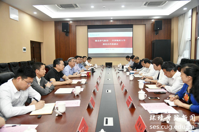 (通讯员孔少飞)5月14日,湖北省气象局党组书记、局长柯怡明、副局长王丽等一行来校访问并召开局校深化合作座谈会,双方围绕科技项目合作、学科建设、人才培养、科技平台和基地建设等方面进行深入交流。中国地质大学(武汉)校长王焰新、校长助理周爱国出席。湖北省气象局办公室副主任李劭翌、观测与网络处处长杨志彪、科技与预报处处长何志学、人事处副处长沈守清、武汉中心气象台台长吴翠红、武汉暴雨研究所所长崔春光、科技与预报处主任科员张宁;中国地质大学(武汉)环境学院党委书记李素矿、教务处副处长张建和、科学技术发展研究院副院长吴春明、学工处副处长朱继、大气科学系教授张仲石、孔少飞、副教授覃军等参加座谈。周爱国主持会议。