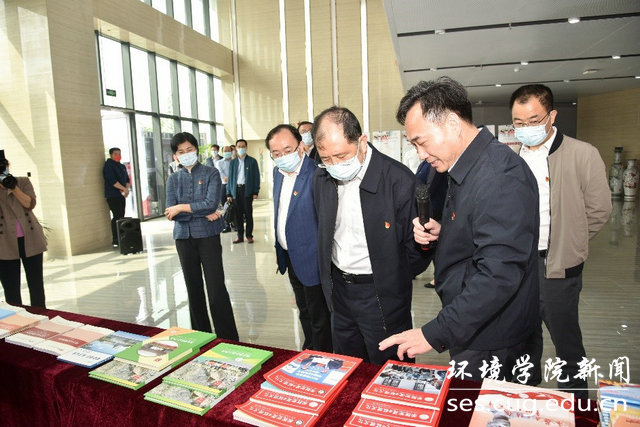 张幸平一行在校党委书记黄晓玫陪同下参观环境学院党建双创工作成果展。院党委书记李素矿汇报环境学院基本情况、党建“双创”工作做法、创新举措和标志成果。