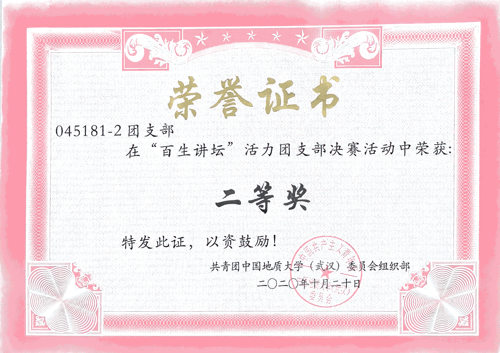 2020年校级“百生讲坛”活力团支部二等奖 |