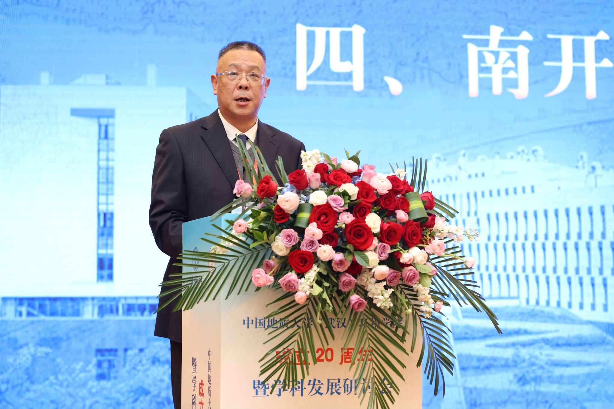 中国地质大学(武汉)校长王焰新院士讲话。他深情回顾了环境学院建院以来的不易,他指出,20年来能够取得一些发展成就,靠的是学校几届党委行政的正确领导,靠的是学院领导班子和师生们发扬“艰苦朴素、求真务实”的校训精神和1952年以来传承下来的“老水文人”奋发图强的优良传统,靠的是学术界、产业界、各级政府部门和海内外校友的关心支持。要倍加珍惜,感恩奋进,当仰无愧于天、俯无愧于地、行无愧于人、止无愧于心,当永葆赤子情怀,永存敬畏之心,永做奋斗之士。