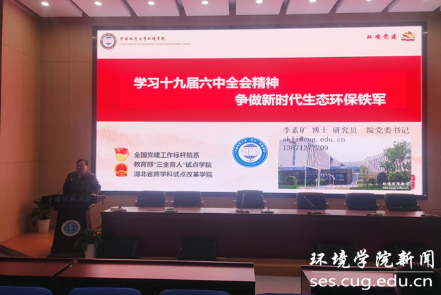 2021年11月24日中午,环境学院第七十一期入党积极分子培训班第一课在科教四楼108报告厅展开。环境学院党委书记李素矿以“学习十九届六中全会精神,争做新时代生态环保铁军”为题讲授党课。