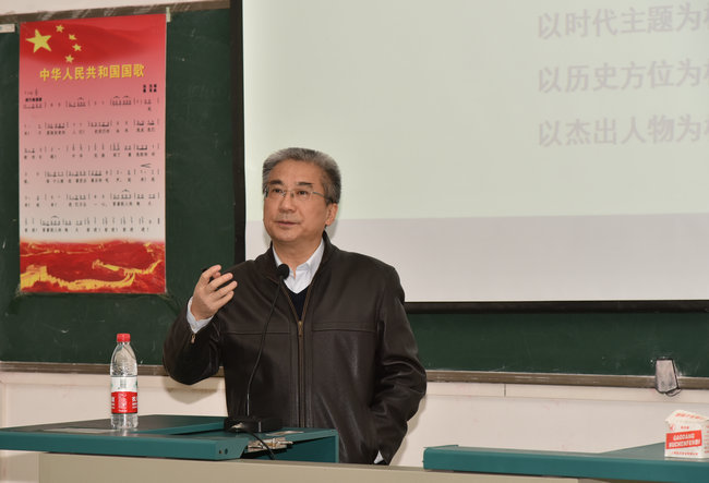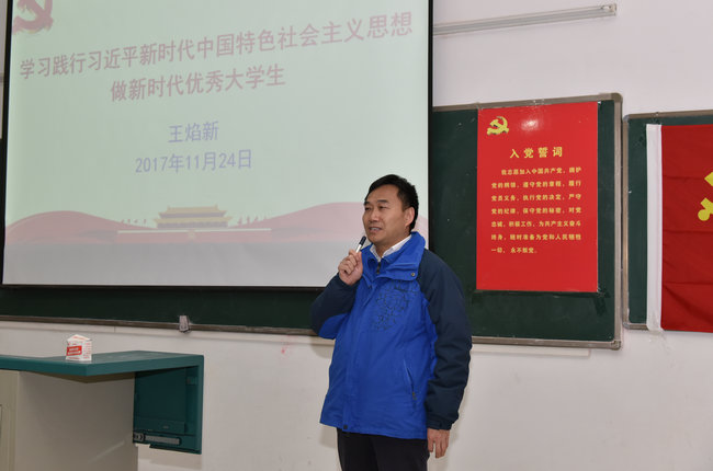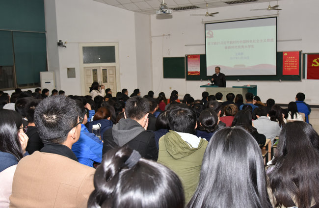 (环境学院张学海 孟国强)2017年11月24日晚在化学楼一层阶梯教室,王焰新校长以“学习践行习近平新时代中国特色社会主义思想,做新时代优秀大学生”为题讲党课。环境学院党委书记李素矿,环境学院学工组全体老师,学院学生党员、入党积极分子、学生干部等参加了党课学习。