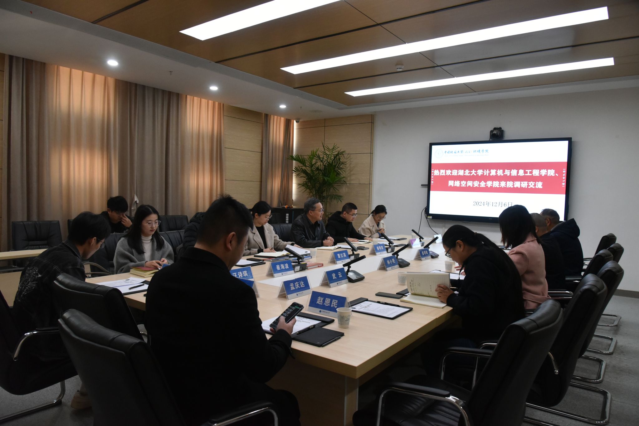 (通讯员陈俊男 摄影/编辑耿婧)12月6日,湖北大学计算机与信息工程学院党委书记秦明君,党委副书记覃红英,网络空间安全学院党委副书记马兴建,湖北大学-贵州税务研究生工作站党支部书记崔海波,辅导员汪诗琪、朱奎闽、张剑恒以及30余名学生来我院调研党建“双创”和人才培养工作。我院党委书记姜明敏,计算机学院党委副书记林小艳,计算机学院应用系党支部书记武云,我院院直党支部书记张学海,辅导员孟庆达、陈俊男、赵恩民以及党团学生代表等参加相关交流活动。陈俊男主持本次调研交流。