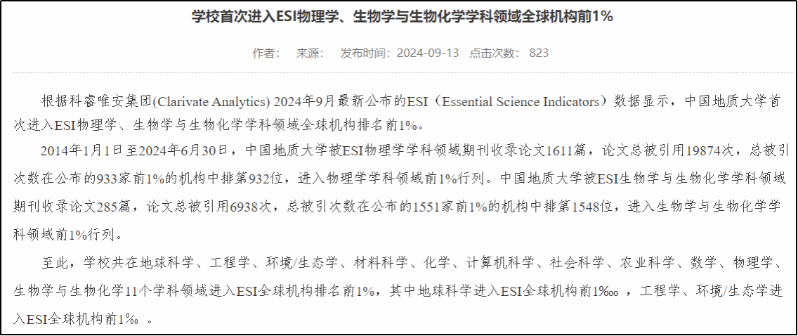 学院首次进入ESI生物学与生物化学学科领域全球机构前1%