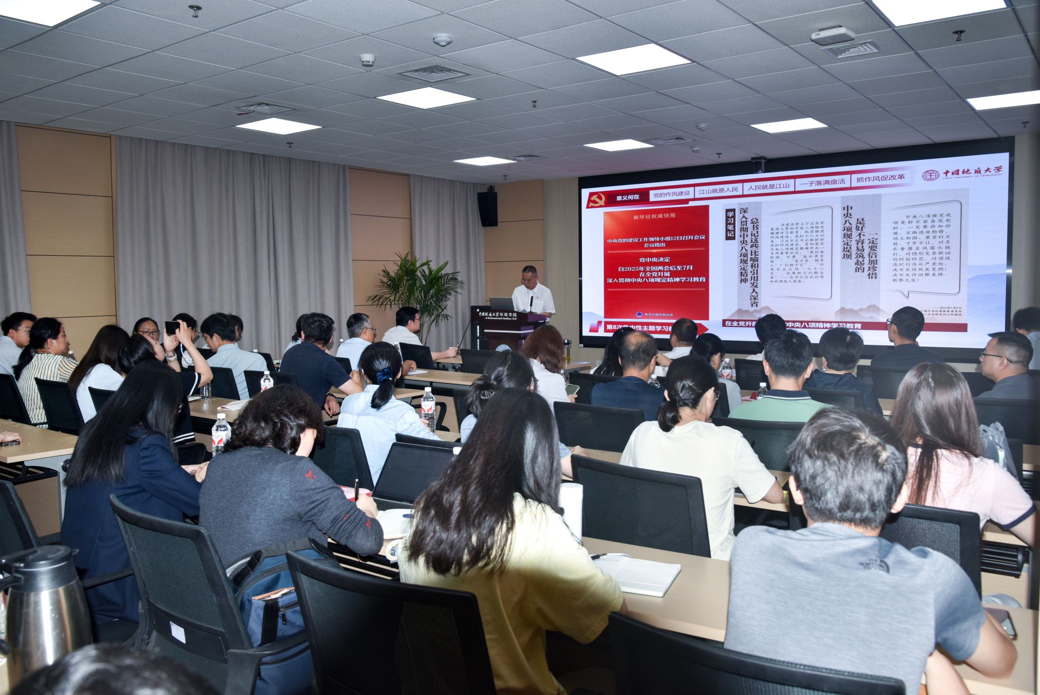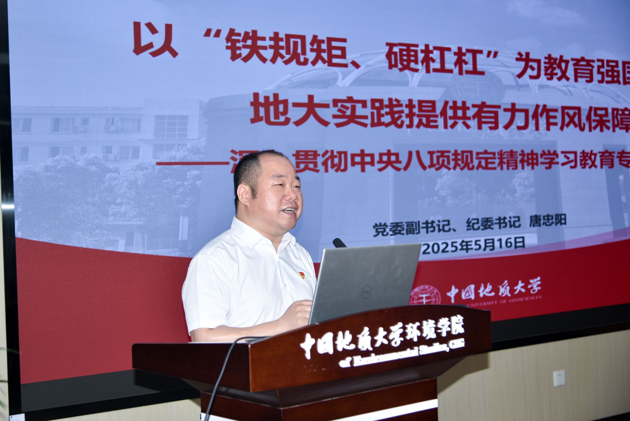 (摄影张学海 通讯员/编辑王孟雪)2025年5月16日,校党委副书记、纪委书记唐忠阳为环境学院和计算机学院师生讲授深入贯彻中央八项规定精神学习教育专题党课,主题是“以铁规矩、硬杠杠为教育强国建设地大实践提供有力作风保障”。环境学院和计算机学院二三级领导班子成员,学生党支部书记参加学习。