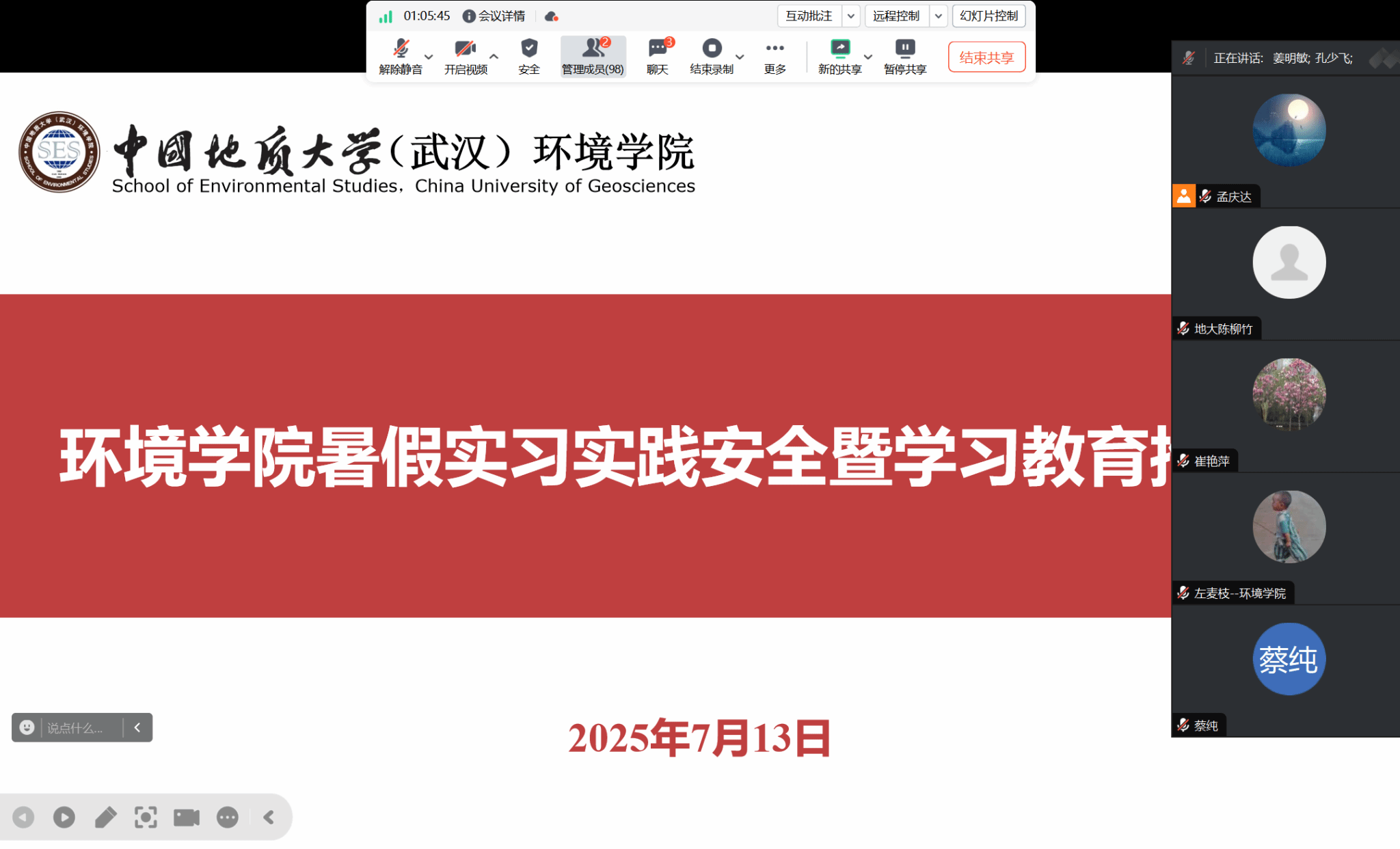 (通讯员付苑婷 编辑申墁烨)7月13日晚,环境学院线上召开2025年暑期实习实践安全暨学习教育推进会,学院领导班子成员及全院教职工参会。副院长孔少飞主持会议。