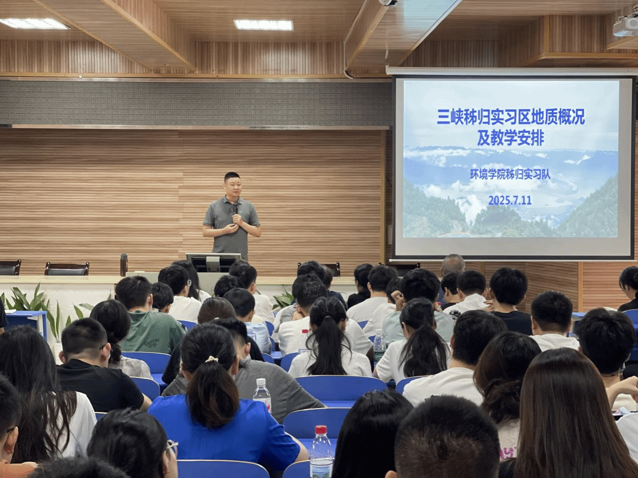 通讯员刘欣然 摄影刘欣然、答世华 编辑申墁烨)7月11日上午,环境学院“秭归野外地质实践教学”实习动员大会在学校秭归产学研基地综合楼阶梯教室召开,实习队教师、辅导员以及全体实习学生参加动员会。实习队队长、水资源与水文地质系副教授黄琨主持会议。