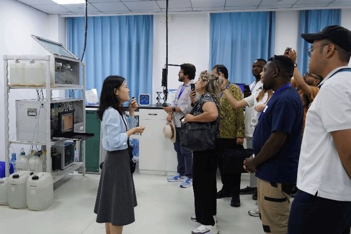 环境学院汪琼琼教授、国际合作处郑适萌老师、湖北省生态环境监测中心站大气室祝波和许可副主任、王珂工程师带领学员参观中心,并详细介绍了包括大气物理、大气化学、大气光学、卫星遥感和卫星反演等系列先进监测仪器设备,简要介绍了仪器的原理、监测指标和数据应用等相关知识。