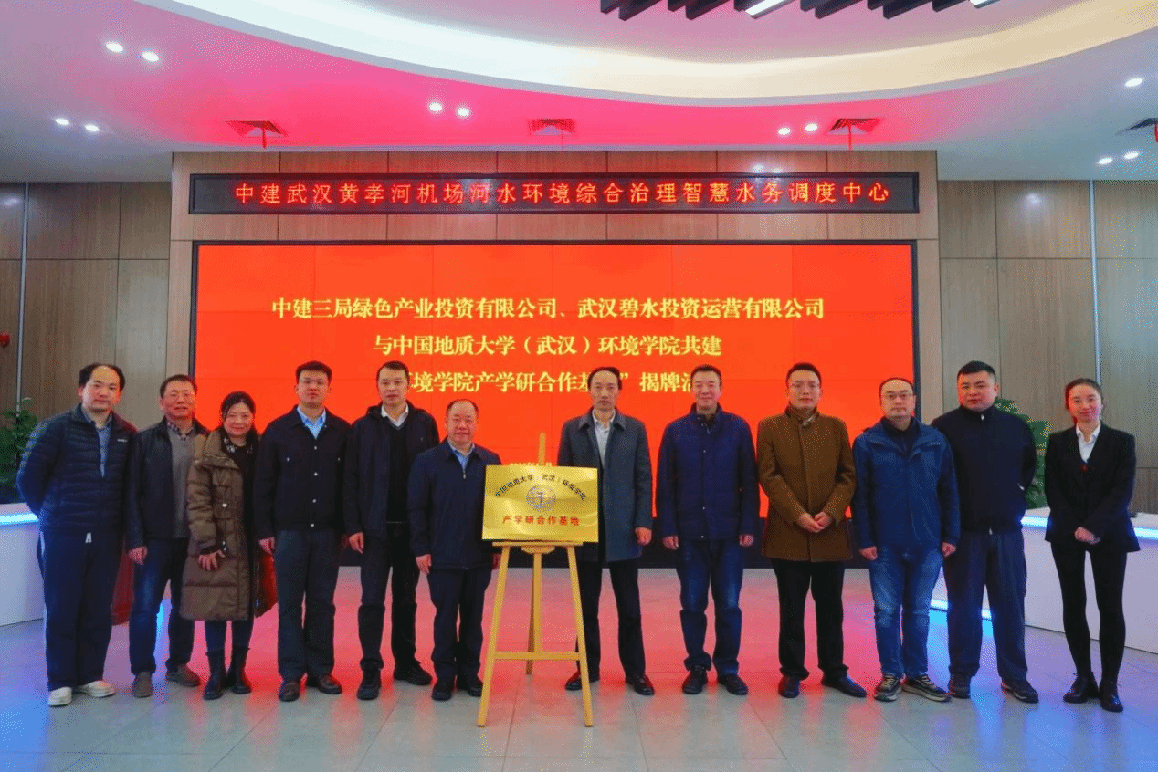 中建三局绿投公司党委副书记、工会主席舒国荣,水务环保事业部工会主席武念,黄孝河机场河二期项目负责人李进,运营项目联合党支部副书记胡刚以及武汉碧投公司黄孝河机场河项目公司董事林华,生产运管中心副部长邓聪,黄孝河机场河项目公司副总经理王骏等参加揭牌活动,环境学院党委书记姜明敏,环境系教师李立青、皮坤福、颜诚,学院办公室主任刘凤莲等一行参观了中建武汉黄孝河机场河水环境综合治理智慧水务调度中心,三方开展座谈交流并举行揭牌仪式。仪式由绿投公司水务环保事业部工会主席武念主持。