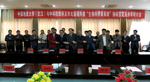 3月24日上午,学校在惠宾楼四层会议室举行共建“生物科学菁英班”协议签订及办学研讨会。参加此次会议的有来自中国科学院微生物研究所、生态环境研究中 心、城市环境研究所、武汉植物园及深圳华大基因研究院五家单位的领导和专家,中国科学院院士殷鸿福、校领导郝翔、王焰新、赖旭龙、万清祥以及校办、教务 处、学工处、环境学院的领导等参加了签约仪式。