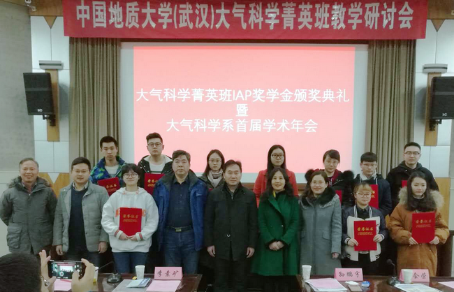 (通讯员孔少飞 编辑张学海)1月4日,我院大气科学系“大气科学菁英班IAP奖学金”颁奖典礼在我校举行。中科院大气物理研究所研究生部孙鹏宇主任、环境学院党委书记李素矿,副院长祁士华、郭会荣,副书记朱继,大气科学系李双林主任以及大气科学系全体教师、研究生和大二本科生参加此次颁奖典礼。