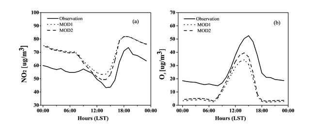 以2013年12月重霾污染过程为例,利用WRF-Chem大气化学模式分别模拟大气环境质量对电厂排放源更新前(MOD1)和后(MOD2)污染物排放变化的响应,发现更新后的江苏电厂清单显著改善了空气质量模拟效果(如O3、NO2等的模拟浓度,图2)。