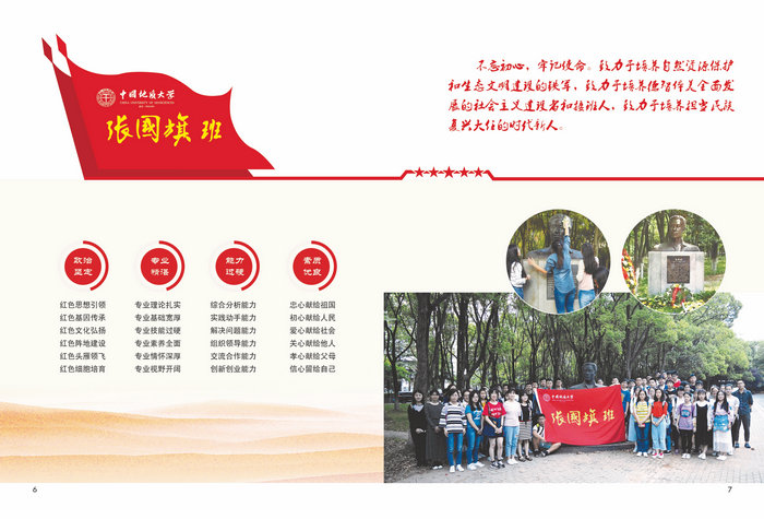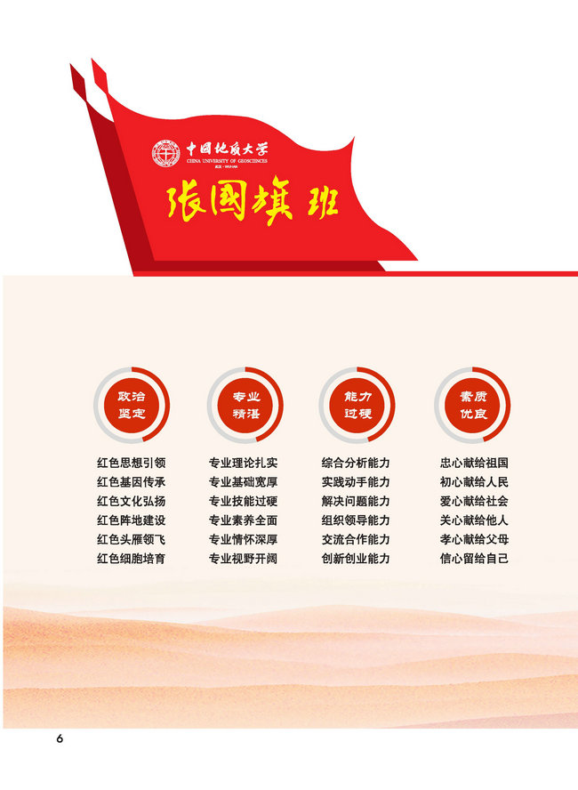 “张国旗班”行动计划,以政治坚定为出发点,以专业精湛为切入点,以能力过硬为着力点,以素质优良为落脚点,聚焦人才培养中心任务,坚持育人导向和问题导向,推进跨学科专业交叉融合、教学与科研实践融合、创新创业教育与专业教育融合,充分挖掘学院层面育人元素和学院微观育人逻辑,统筹规划立德树人根本任务,构建水、土、气、生的大环境学科群一体化育人模式,将“三全育人”融入学院人才培养、科学研究、社会服务、文化传承创新和国际交流合作之中,贯穿学院一流学科建设和湖北省改革试点各项工作任务,致力于培养自然资源保护和生态文明建设的铁军,致力于培养德智体美全面发展的社会主义建设者和接班人,致力于培养担当民族复兴大任的时代新人,为国家输送更多更优秀的自然资源保护和生态文明建设的高素质创新人才。
