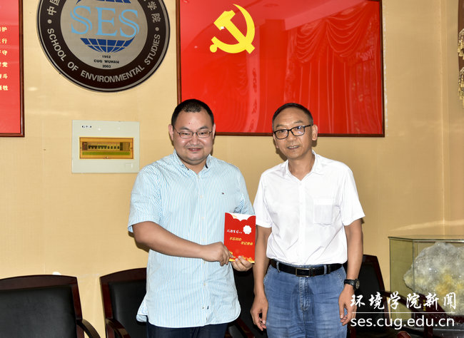 院直党支部成员、环境学院党委书记李素矿和院直党支部书记张学海分别为“政治生日”在六月份的补建伟、杨涛两位同志颁发“政治生日”纪念卡。