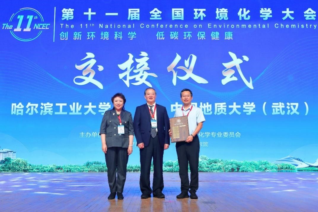此外,中国化学会环境化学专业委员会投票决定,第十二届全国环境化学大会将由中国地质大学(武汉)环境学院承办。在29日下午举行的大会闭幕式上,大会主席江桂斌院士从哈尔滨工业大学冯玉杰教授手中接过承办方名匾,并传递给中国地质大学(武汉)环境学院院长史建波教授。