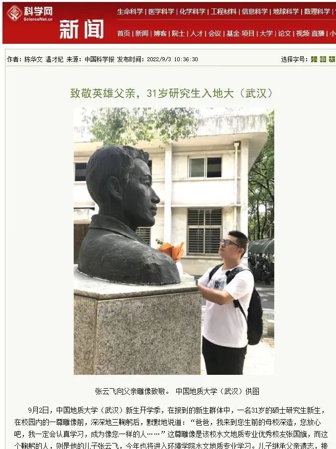 (转自中国科技报 作者陈华文 温才妃)9月2日,中国地质大学(武汉)新生开学季,在报到的新生群体中,一名31岁的硕士研究生新生,在校园内的一尊雕像前,深深地三鞠躬后,默默地说道:“爸爸,我来到您生前的母校深造,您放心吧,我一定会认真学习,成为像您一样的人……”这尊雕像是该校水文地质专业优秀校友张国旗,而这个鞠躬的人,则是他的儿子张云飞,今年也将进入环境学院水文地质专业学习。儿子继承父亲遗志,接续学习水文地质学,感动了师生们。