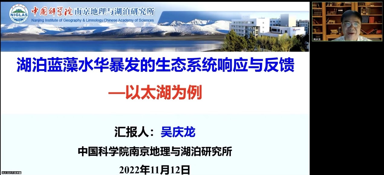吴庆龙研究员从太湖富营养化与蓝藻水华的关系、太湖生态系统结构的变化以及太湖生态系统恢复的思考等三个方面作报告。