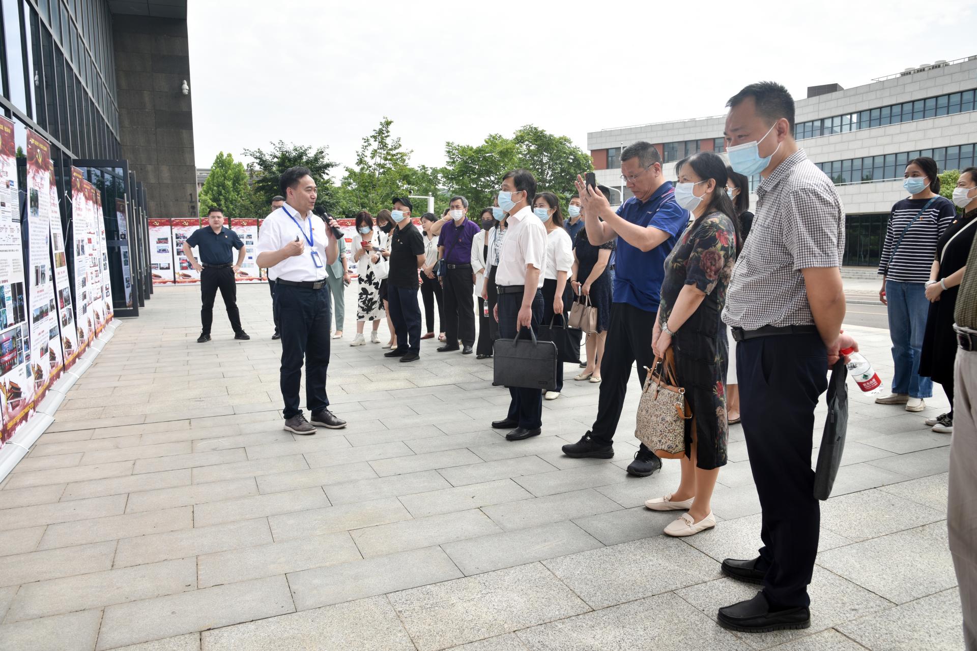 与会人员集体参观以英雄榜样人物命名的全国党建工作样板支部成果展板及环境学院党建“双创”工作成果展板,李素矿介绍了以英雄榜样人物命名的全国党建工作样板支部基本概况和建设成果,重点讲解了环境学院基本概况、党建工作体系、三全育人改革、跨学科教育研究、张国旗班行动计划、“4+N”美丽中国课程思政、“1+6”党建资政育人载体、兄弟院校交流互鉴、领导关怀指导和社会媒体反响等十个方面,全面反映了学院党委近年来党建示范创建和质量创优工作取得的创新性理论成果、制度成果、实践成果和特色成果,是环境人干事创业、追求卓越的汗水结晶。