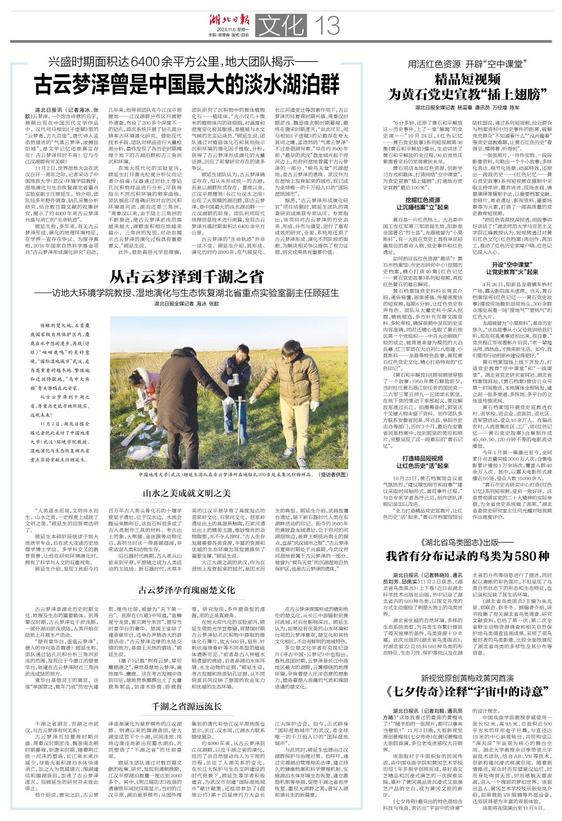 2023年11月6日,《湖北日报》文化版刊发了我院生物系顾延生教授团队有关江汉湖群演化与保护的研究成果,报道从“山水之美成就文明之美、古云梦泽孕育瑰丽楚文化、千湖之省源远流长”等三个方面详细介绍了古云梦泽的兴盛与演化历史,从古云梦泽到千湖之省的心路历程,反映了由自然驱动向人为干预的历程,见证了人湖关系的变化。近代以来江汉湖群的快速演化与退化趋势值得警惕,呼吁加强江汉湖群保护与治理,谱写人湖和谐共生的新篇章。