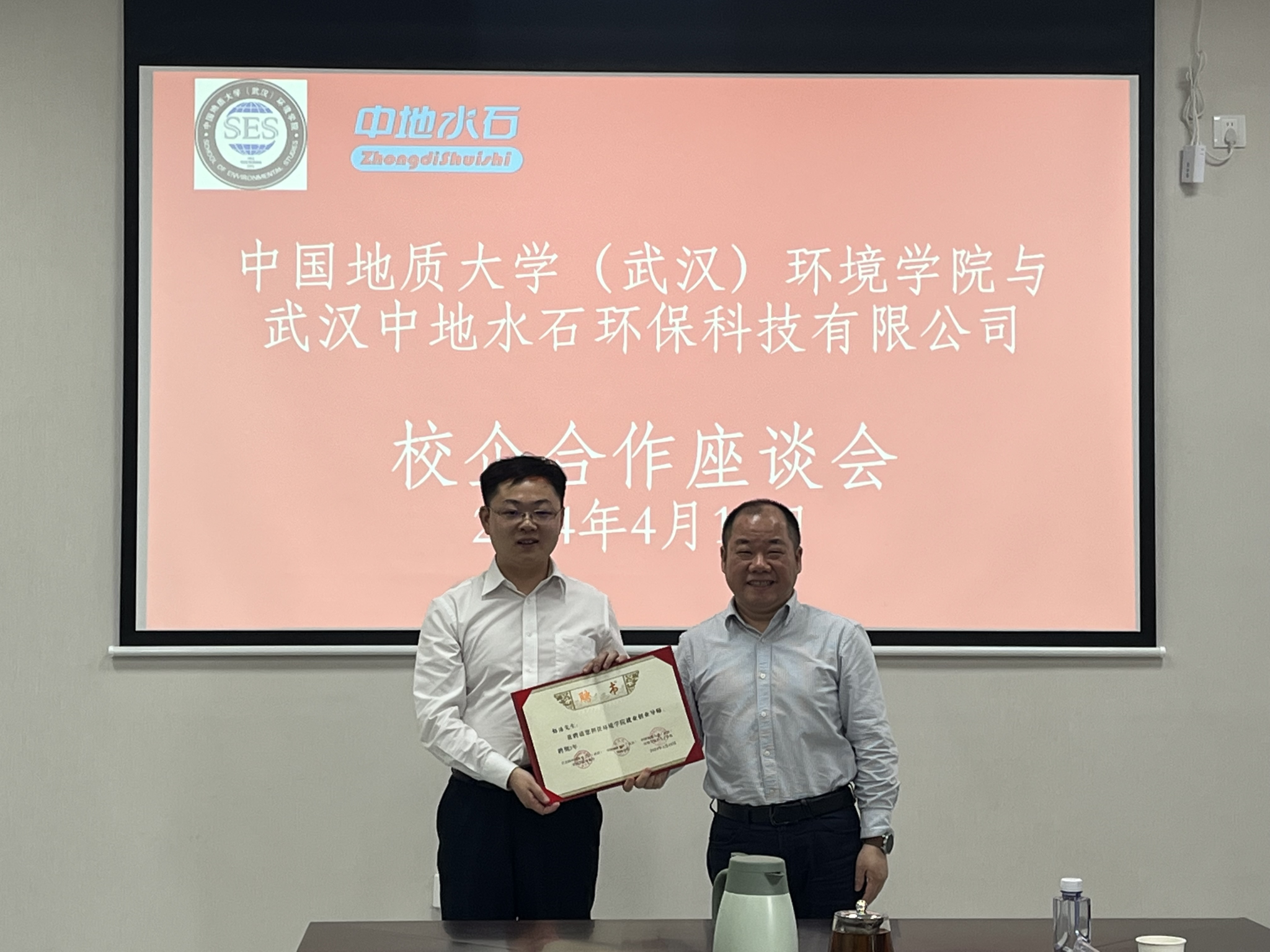 环境学院党委书记姜明敏为武汉中地水石环保科技有限公司创始人、董事长彭浩颁发“环境学院就业创业导师”聘书。