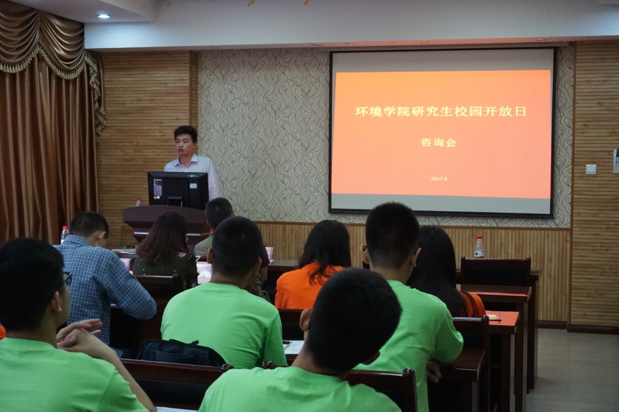 (通讯员余露)6月14-15日,环境学院顺利举办了2017年研究生招生校园开放日活动。2017年6月15日上午10点,环境学院研究生校园开放日咨询会在文华楼205召开。研究生院招生科科长王蕾,环境学院院长马腾、水资源与水文地质系主任万军伟、研究生秘书刘凤莲、研究生辅导员王碧,以及来自各大高校本科生代表等参加会议。研究生工作部部长刘世勇也到场巡视并参加了开幕式。会议由王碧主持。