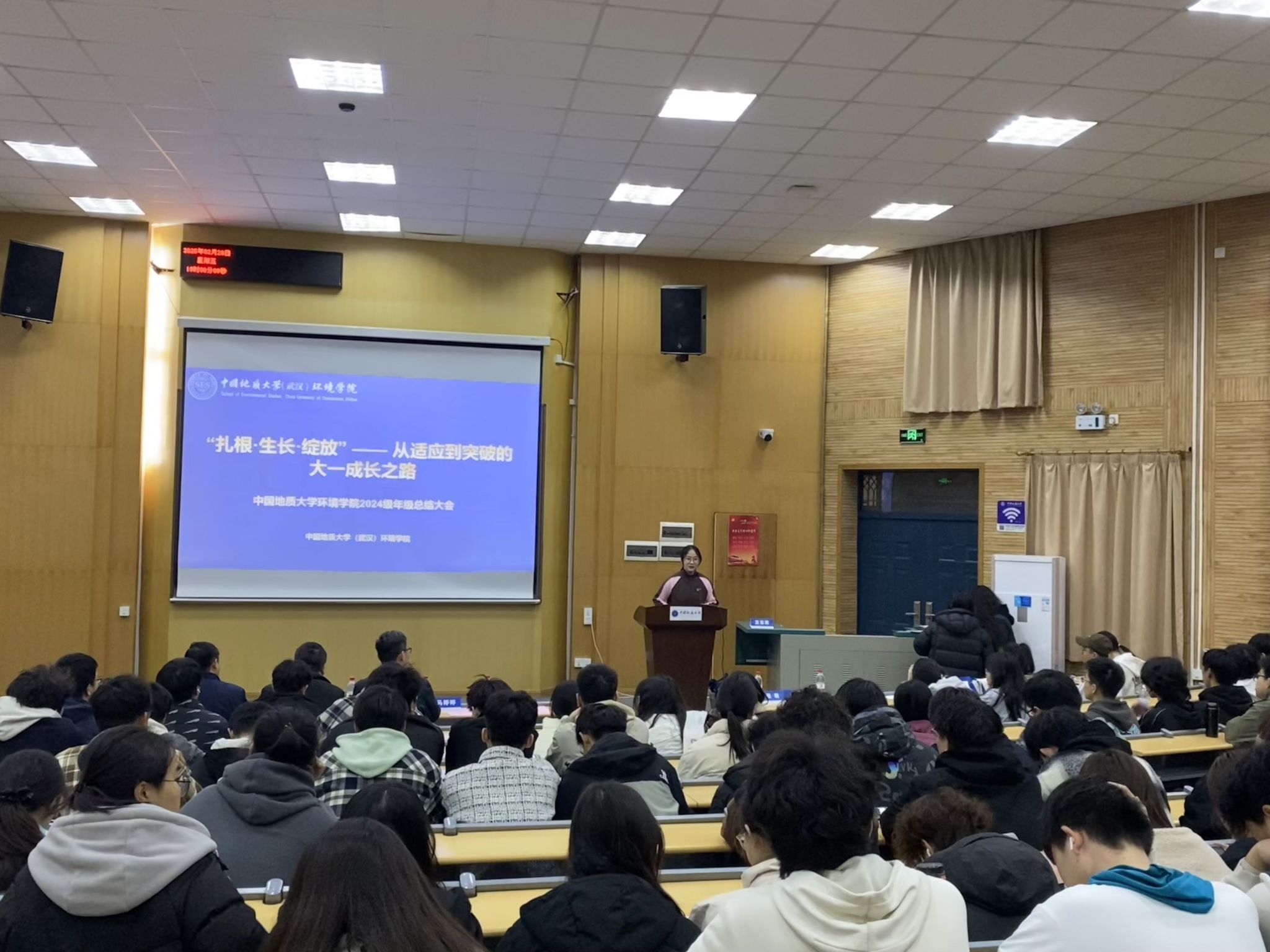 (通讯员宋霖、张朝 编辑王孟雪)2025年2月28日,中国地质大学(武汉)环境学院2024级本科生年级总结表彰大会在教三楼109室举行。本次会议的主题是“扎根 生长 绽放”,从适应到突破的大一成长之路,旨在通过总结学期工作、分享学习经验、表彰优秀学生,为同学们的未来学习和生活指明方向。学院党委副书记王海锋、学校安全保卫部法律援助办主任魏景明、班主任代表潘欢迎、鲁小璐、辅导员宋霖及高年级学生代表出席会议,2024级全体本科生参加会议。2024级本科生辅导员宋霖主持会议。