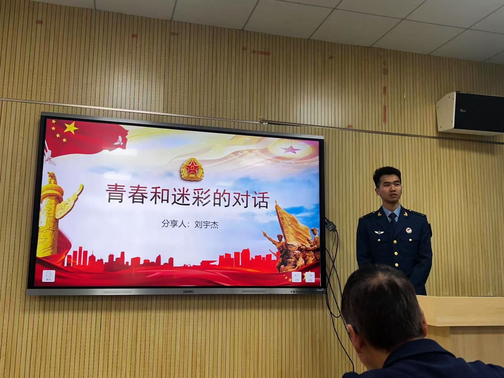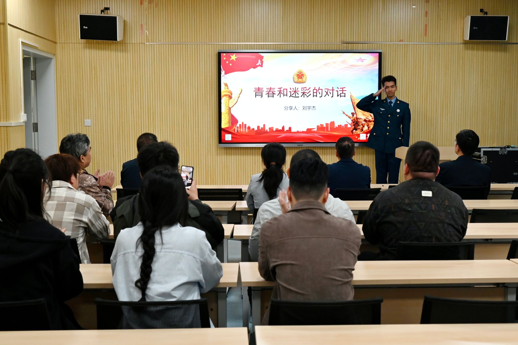 刘宇杰结合军旅生活展开分享。他表示,出于对国家的热爱和对个人成长的追求,自己坚定了参军入伍的决心。在军营中的严格训练,进一步锻炼了自身意志和身体素质,也让他学会了责任与担当,更加珍惜身边的人和事。