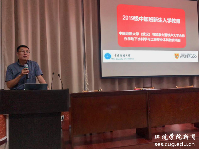 (通讯员、编辑 耿婧)2019年8月31日晚,中国地质大学(武汉)与加拿大滑铁卢大学“地下水科学与工程”专业中外合作办学项目2019级新生入学教育在南望山校区东苑会议室召开。环境学院副院长柴波、院党委副书记姜明敏、045191班主任文章、045192班主任曾斌、中加项目办严冰、教学秘书付苑婷、学工秘书耿婧及2019级中加合作班56名新生和家长共同参加此次会议。