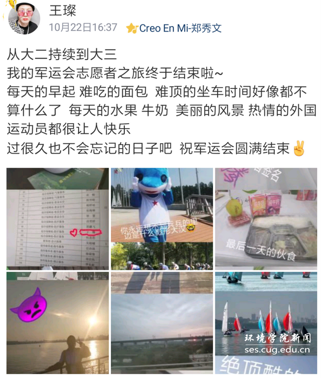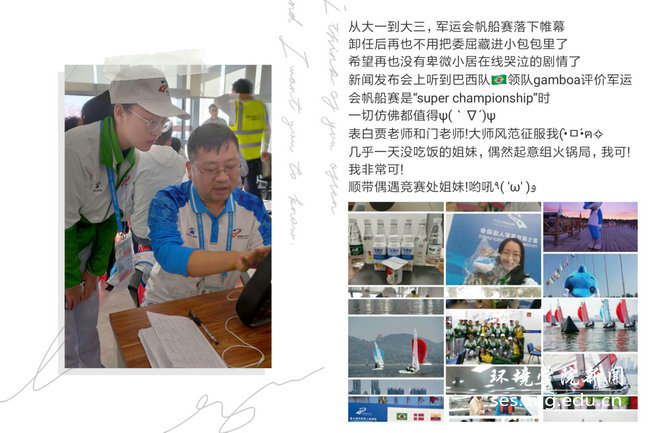 来自环境学院的竞赛组织处志愿者组长、1 7级大气科学专业的林凡分享了自己的志愿服务体会,她说:“参加了这次军运会志愿者活动,并担任竞赛组织处湖心岛区域的负责人,让我知道了如何与同学相处,如何带领好团队,亲身体会到了志愿服务是奉献社会,服务他人的一项工作,是传播爱心,播种文明的过程!”