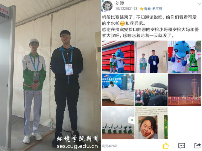 观众服务处的吉祥物“兵兵”扮演者中有两位是环境学院的“小水杉”——17级大气科学专业的哈斯朝鲁和18级水文与水资源工程专业庄胜杰,他们每天在闷热厚重的卡通服里向各位路过的来宾、运动员、工作人员和志愿者挥手打招呼,蹦蹦跳跳成为了帆船赛场上一抹可爱而亮丽的色彩。