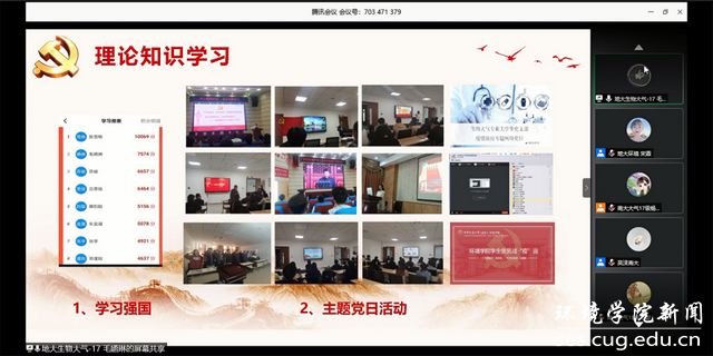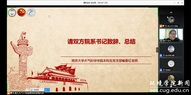(通讯员宋霖、李晴 编辑耿婧)2020年5月23日周六上午十点,中国地质大学(武汉)环境学院生物大气专业大学生党支部与南京大学大气科学学院本科生党支部通过腾讯会议举行了一场别开生面的云共建活动。南京大学大气科学学院党委副书记喻春红、辅导员吴沫,中国地质大学(武汉)环境学院党委副书记姜明敏、党建辅导员宋霖,以及两个党支部的全体学生党员参与此次云共建活动。