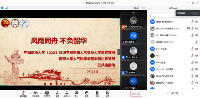 通过这次云共建活动,中国地质大学(武汉)环境学院生物大气专业大学生党支部和南京大学大气科学学院本科生党支部建立了深厚的友谊,未来,两个学院将继续加强交流合作,携手共进,不断推动学院的党建发展、大气学科的建设。